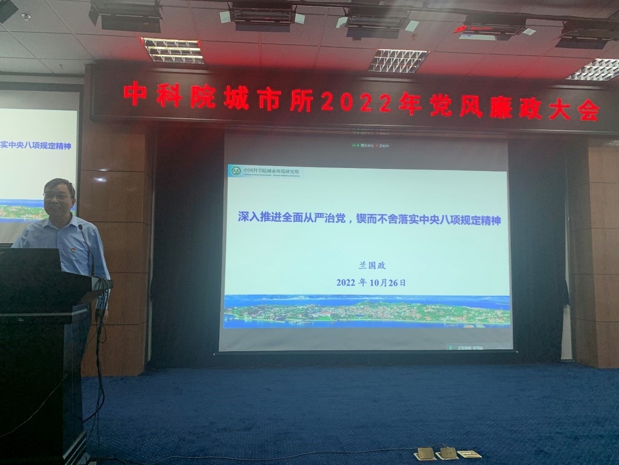 纪委书记兰国政做了题为《深入推进全面从严治党,锲而不舍落实中央八项规定精神》的报告,通报了中央和国家机关违反中央八项规定精神典型问题、科研失信负面清单案例以及研究所2022年内审工作发现的问题,要求大家以案为戒、知戒守规,维护好城市所廉洁从业、风清气正的科研生态环境。