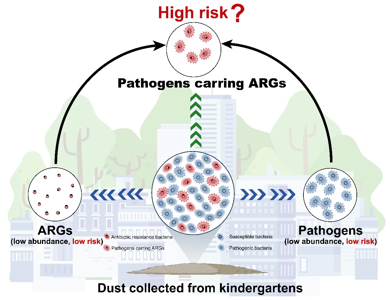 The microorganisms present in kindergartens are extremely important for children’s health during their three-year preschool education. To assess the risk of outdoor dust in kindergartens, the antibiotic resistome and potential pathogens were investigated in dust samples collected from 59 kindergartens in Xiamen, southeast China in both the winter and summer. Both high-throughput quantitative PCR and metagenome analysis revealed a higher richness and abundance of antibiotic resistance genes (ARGs) in winter (P < 0.05). Besides, the bloom of ARGs and potential pathogens was evident in the urban kindergartens. The co-occurrence patterns among ARGs, mobile genetic elements (MGEs), and potential pathogens suggested some bacterial pathogens were potential hosts of ARGs and MGEs. We found a large number of high-risk ARGs in the dust; the richness and abundance of high-risk ARGs were higher in winter and urban kindergartens compared to in summer and peri-urban kindergartens, respectively. The results of the co-occurrence patterns and high-risk ARGs jointly reveal that urbanization will significantly increase the threat of urban dust to human beings and their risks will be higher in winter. This study unveils the close association between ARGs/mobile ARGs and potential pathogens and emphasizes that we should pay more attention to the health risks induced by their combination.